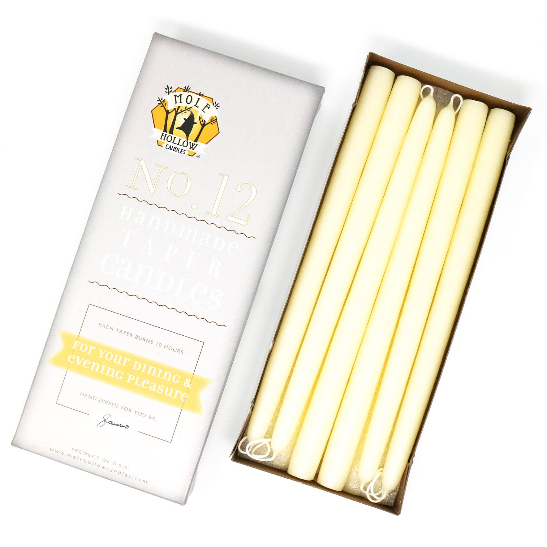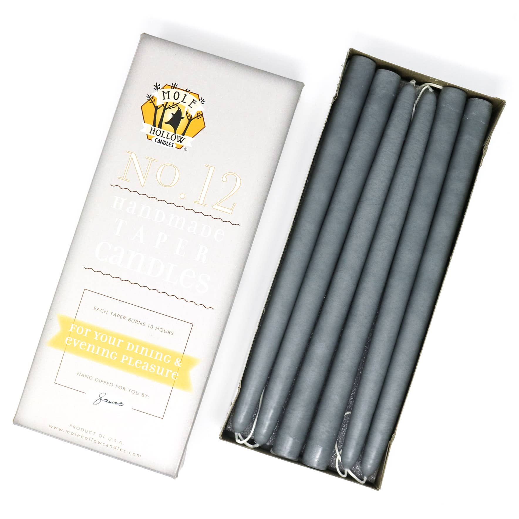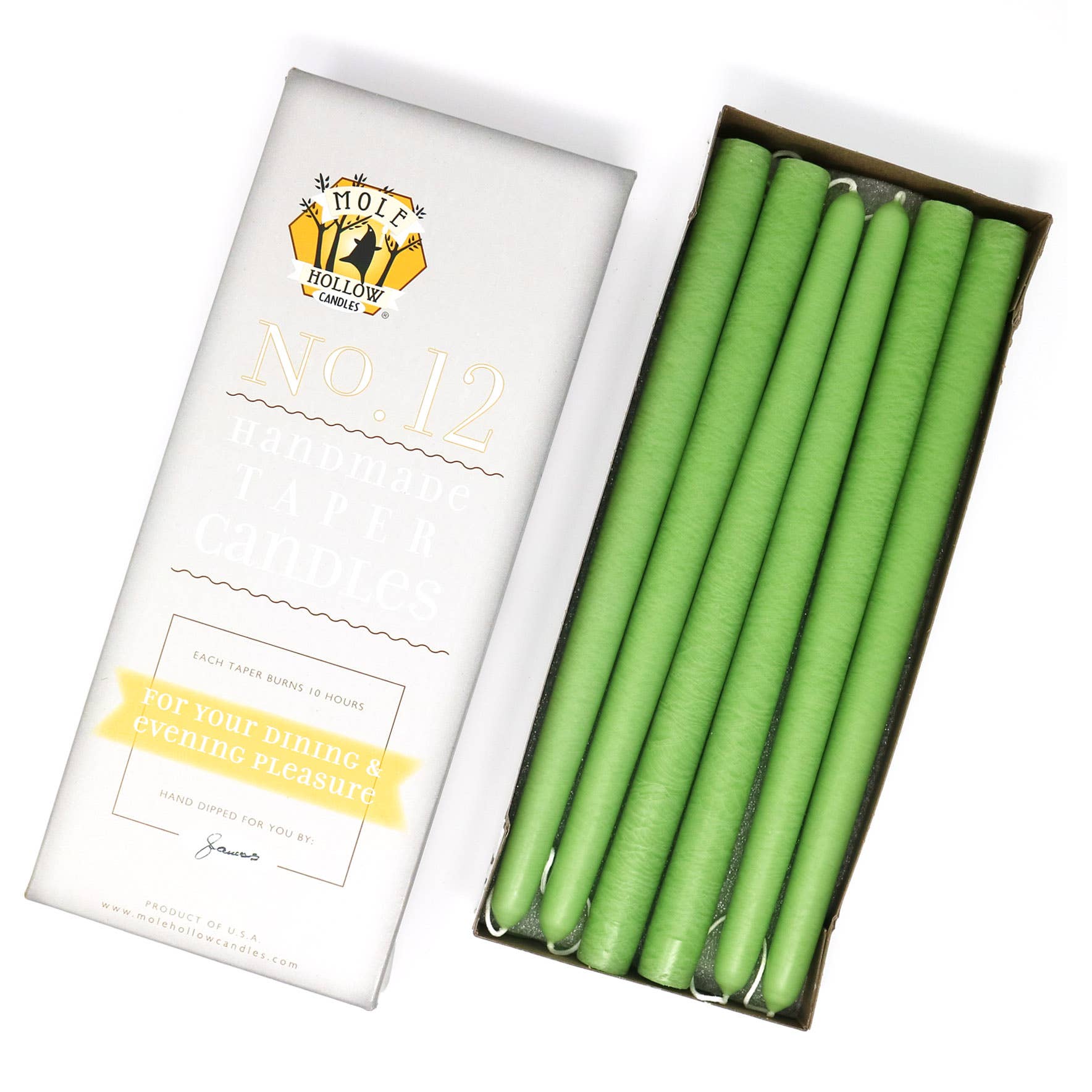 Read moreMole Hollow 12” unscented taper candles are hand dipped and available in 39 colors. Each taper candle has a 100% cotton wick and solid color throughout. Christmas candle color bestsellers include Sweetheart Red, Emerald Green and Stark White. Thanksgiving candle favorites are Burgundy, Yellow Gold, Granny Smith Green and Terra Cotta. Or, stock your shelves with neutral tapers in shades such as Off White, Ivory and Slate Grey. Tapers are sold in cases of 6 pairs. Per pair price is displayed. • Each pair is connected at the wick + labeled for individual sale • 12” height, 7/8” diameter • Sized to fit a standard candlestick • Each taper burns for approximately 10 hours • Dripless + smokeless when burned under normal indoor conditions • Unscented • Hand dipped in Sturbridge, MA