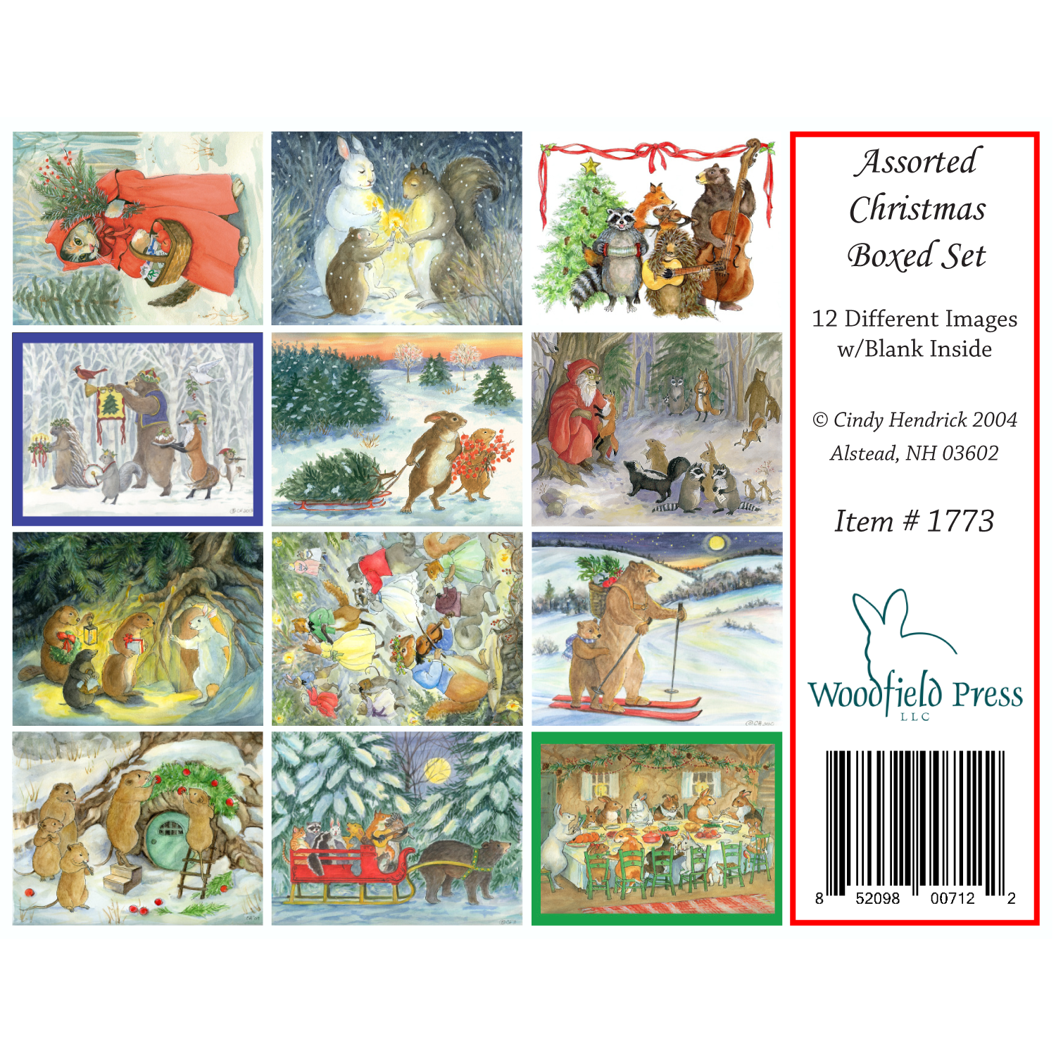 Read more12 assorted Christmas season images with 12 red envelopes packaged in a clear box. The cards measure 4-1/8" x 5-1/2" and are printed on heavyweight paper for stand-up display. Similar to individual card design except Winter Feast has a green border, Christmas Procession has a purple border, and the rest have no border. The 12 cards included are: Green Gathering, Old Grandfather, Winter Feast, Red Cloak, Yuletide Friends, Christmas Band, Candle Lighting, New Year's Ball, Door Decorations, Bears Skiing, Sleigh, and Christmas Procession.