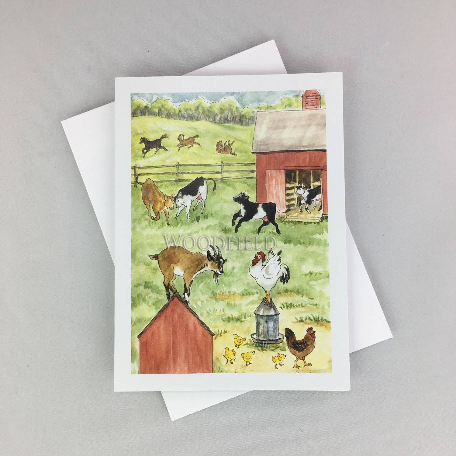 Individual 5-1/8" x 7" notecard comes with a white envelope. Front of card has image with a white border. The inside is blank. A short storyline is written on the back of the card. "Springtime on the farm is always a somewhat giddy affair.