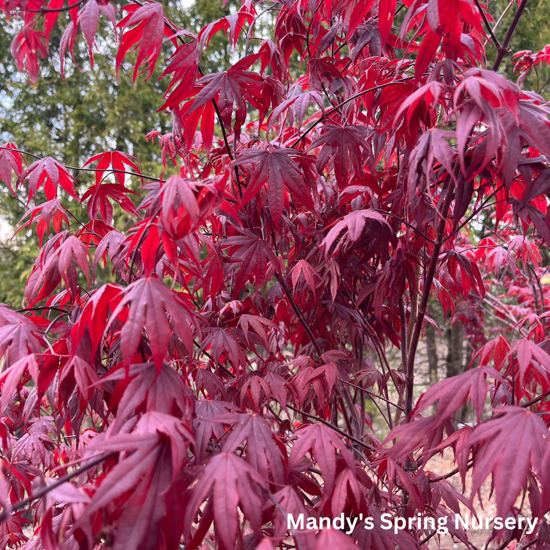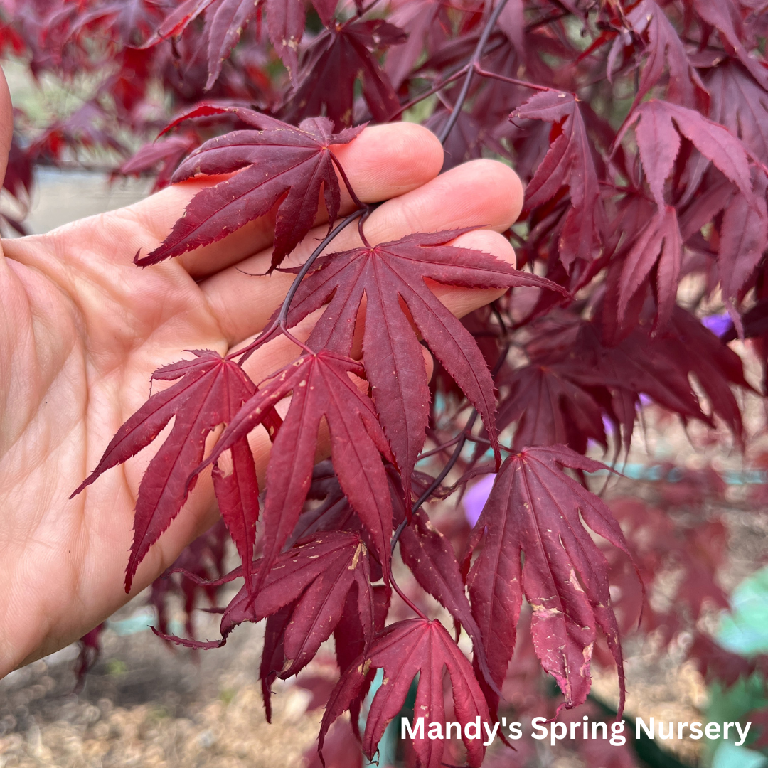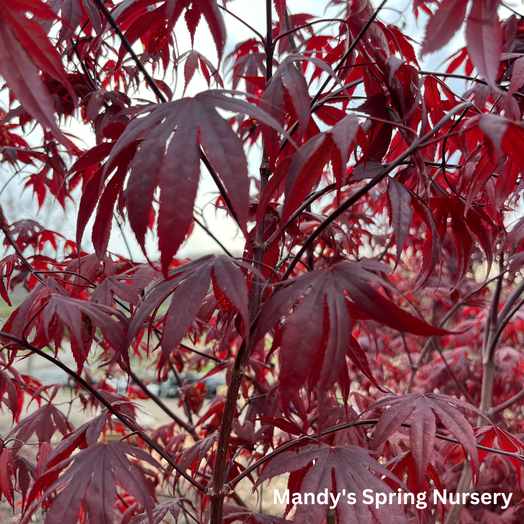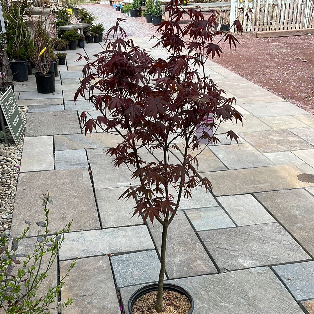 A small statement tree with burgundy foliage that turns brilliant red in the fall. A hardy Japanese maple tree, with good sun tolerance. Mature Height: 15-20' tall Mature Spread: 10-15' Exposure: Full Sun to Partial Sun Growth Rate: Slow Zone Hardiness: 5-9.