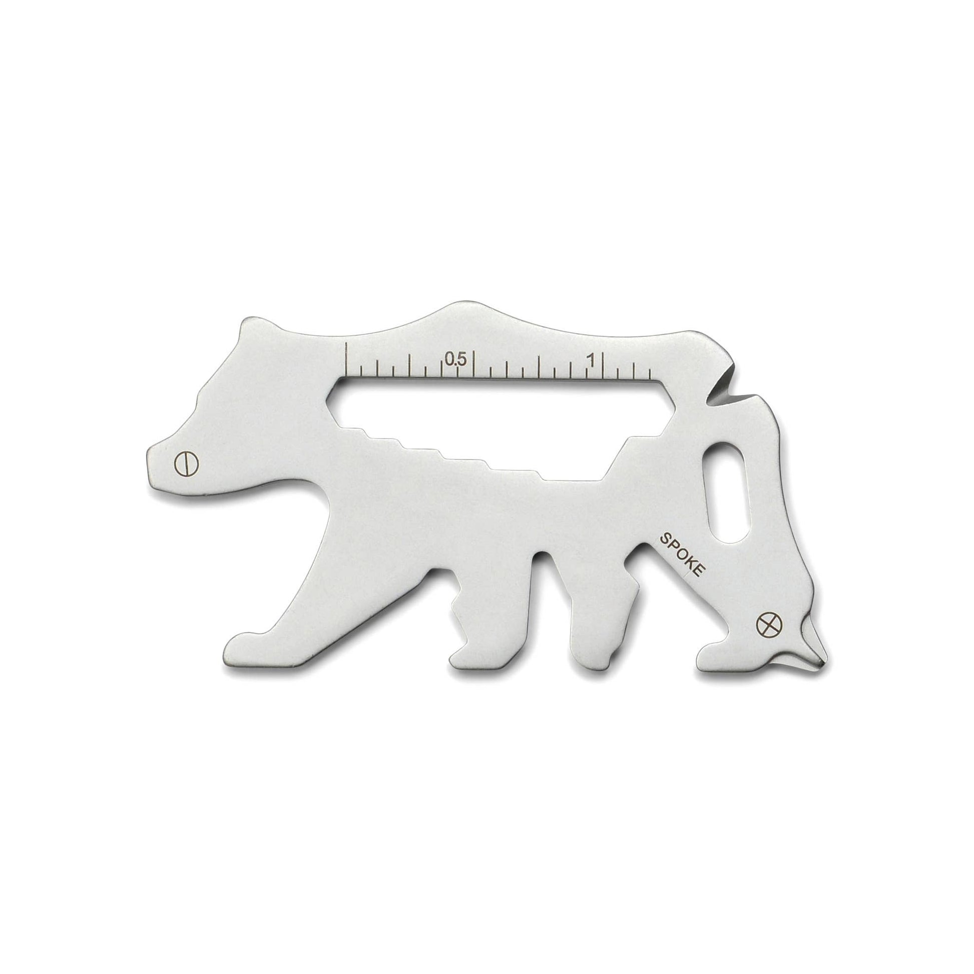 15-in-1 Stainless Steel Bear Multi-Tool features nail pry, ruler, flathead screwdriver, crosshead screwdriver, hex wrench (5/5. 5/6/7/8/9/10mm), spoke key, hex wrench 4mm, and bottle opener.
