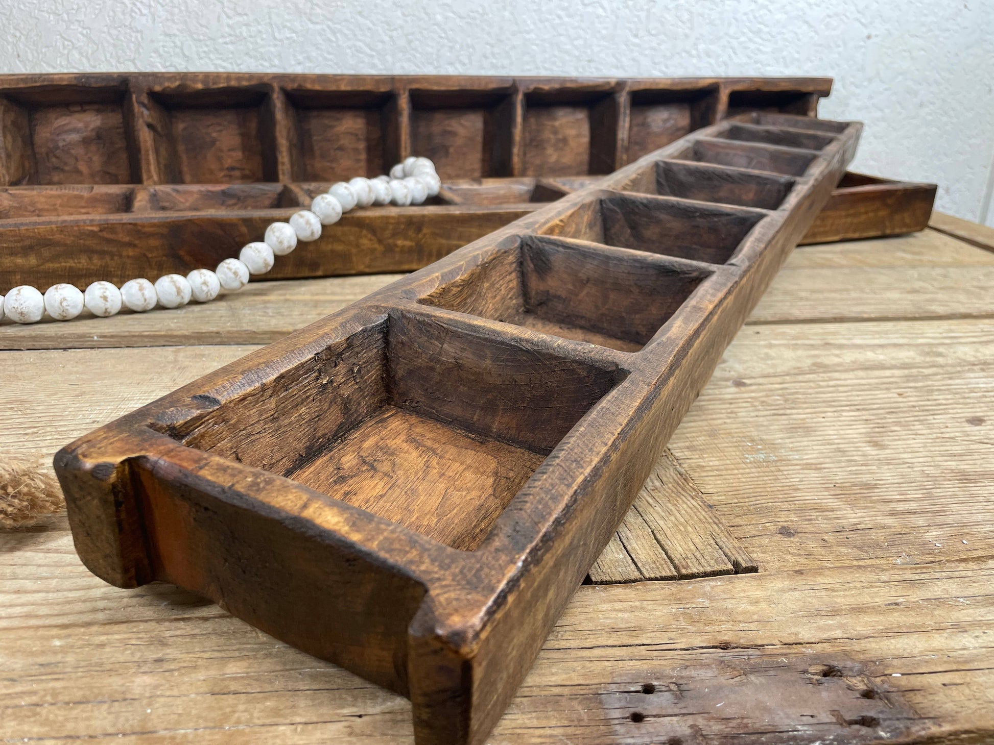 Read moreBrand new design for us. These are great for displaying small items or using as display piece. Great for entertaining, decorating. Please understand that the sizes will vary slightly. NOTE: Please understand that these bowls are a natural handmade product and will never be "perfect" That is what makes them rustic and beautiful. Tone, smoothness, shape,etc, all rustic and never machine-made. . Please keep that in mind when you buy these. Brazos Ladder Dough Bowl-Home Decor-Waxed Size- 6 inches wide 38-40 inches long 2-2.5 inches deep 10 fluid ounces each compartment Each hole is about 4.5x4.5 inches
