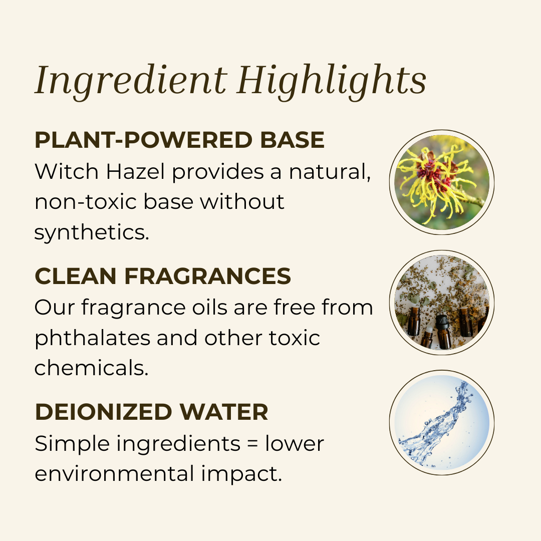 Invite our HVSC at Home Room & Linen Spray to freshen up the sanctuary you call home. Made with organic witch hazel and a warm blend of citrus and cinnamon essential oils.