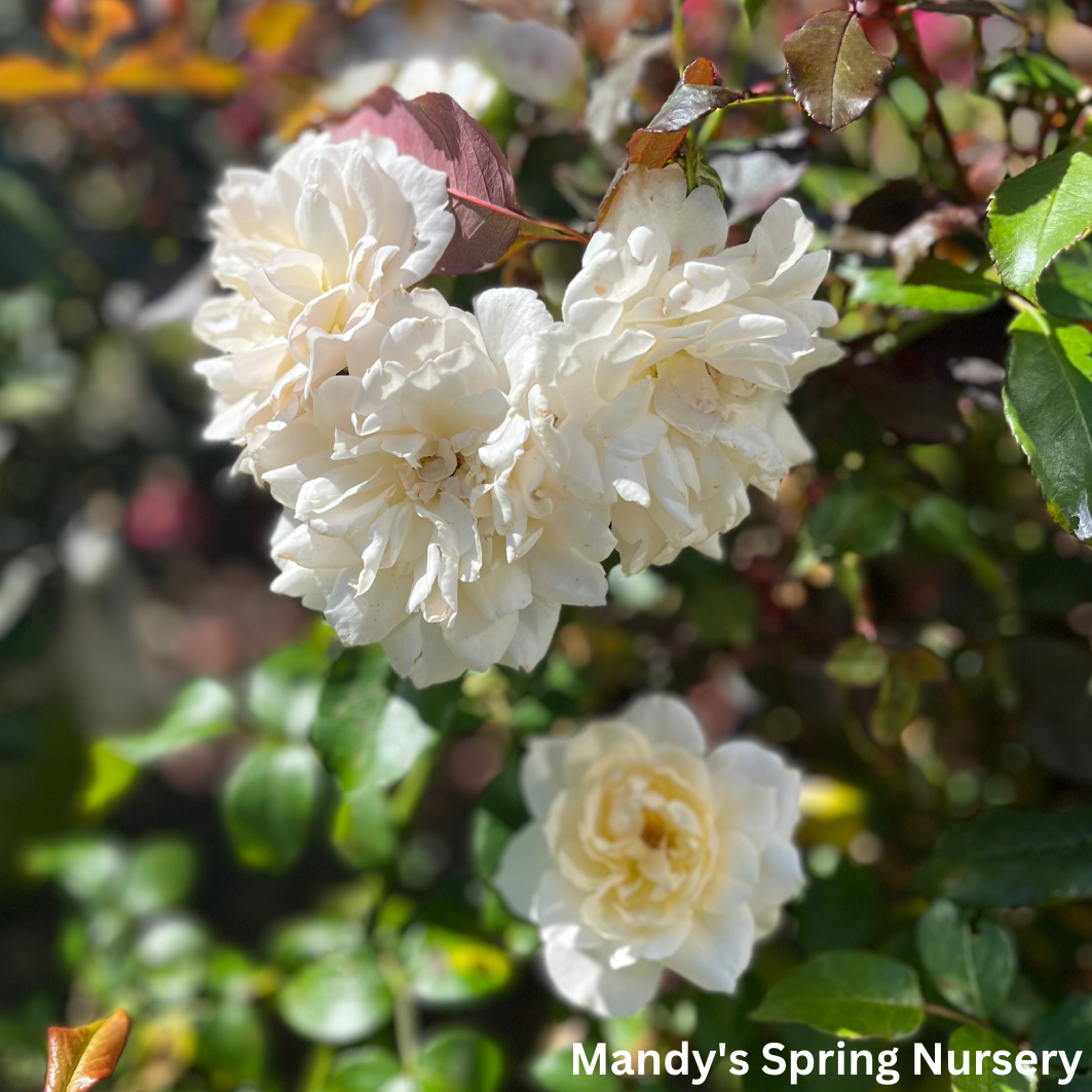 Clusters of soft apricot buds open fully to blooms of antique white with just a hint of apricot before fading to a clear white. Combines beautifully with perennials in a mixed border or plant as a refined low hedge. Disease-resistant medium green foliage. Own root.