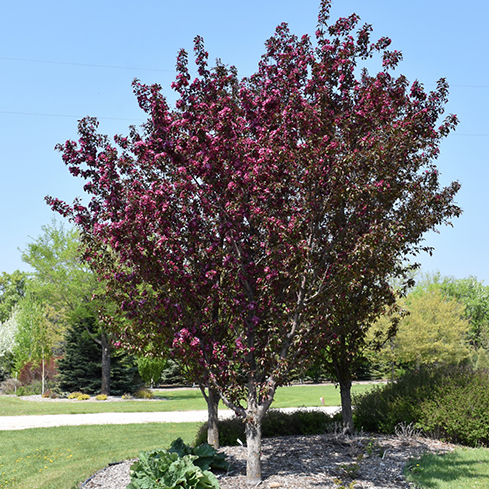 Gladiator™ is an excellent ornamental tree with a profusion of bright pink flowers followed by small reddish-purple fruit on a stately, upright crown. Glossy bronze-purple leaves are darker and glossier than Purple Prince, remain lush all season long and are highly disease resistant.