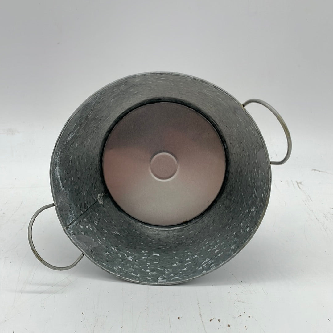 Galvanized planter with no drainage. Flowers & Garden text in black.