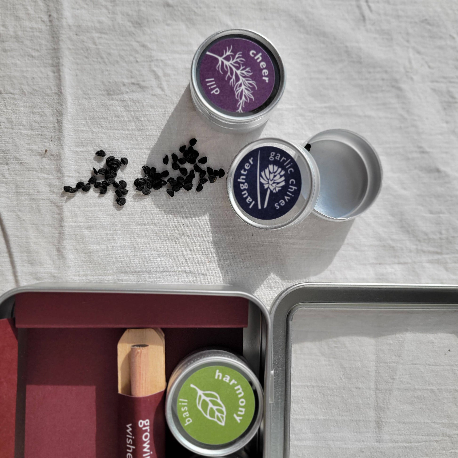 Read moreThis kit pairs six varieties of organic herbs with the sentiment it symbolizes {dill/cheer, oregano/peace, sage/gratitude, thyme/health, basil/harmony, garlic chives/laughter). These herbs are easy to grow, fragrant and include a wonderful culinary collection for any cook. As they grow you are reminded of nature's simple beauty. Plant outdoors in a garden or in containers. Includes: 6 organic seed varieties, steel case, wooden garden stakes with pencil, planting & growing directions. Handmade in Idaho. Great gift for cooks! Our Growing Wishes Herb kit brings cheer and makes a thoughtful holiday gift, perfect for Christmas displays, seasonal gifting, boutique shops, artisanal gifts, indoor gardens, botanical gifts, herb gardening, holiday décor, gardeners, and Faire buyers seeking handmade treasures.