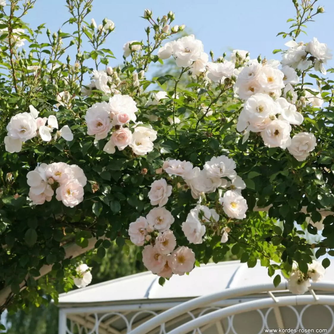 'Hella' is a very vigorous and floriferous climber, whose pure white, slightly fragrant cups show golden yellow stamen in the centre. Its long and supple shots may reach 3 m of height, so this climber is ideal for greening walls and pergola. ADR® 2010.