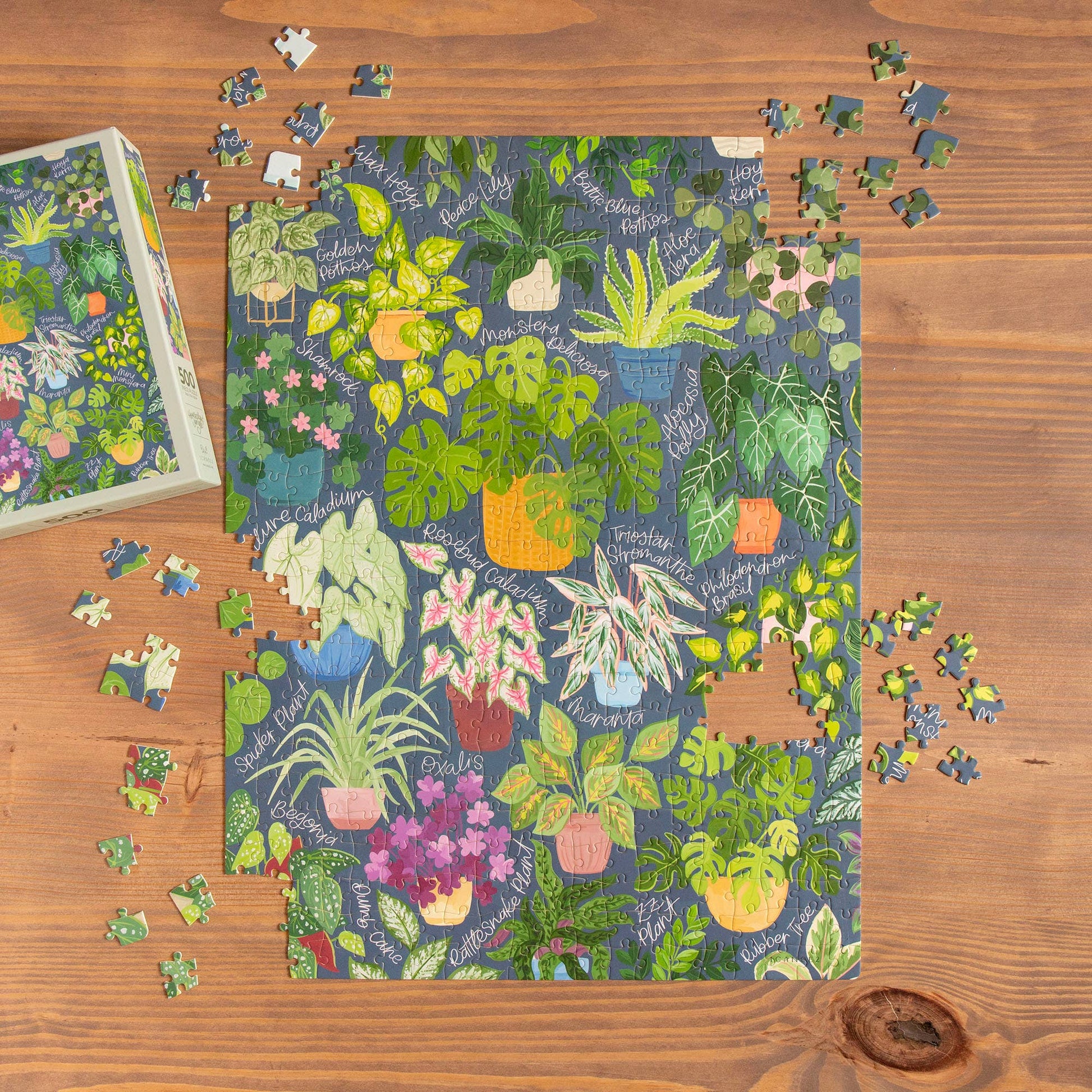 Read moreImmerse yourself in the lush world of greenery with our Houseplant Jungle 500 Piece Jigsaw Puzzle. Against a navy background, this puzzle features detailed illustrations of houseplants, including monstera deliciosa, peace lily, allure caladium, rosebud caladium, alocasia polly, golden pothos, hoya, spider plant, begonia, zz plant, and more. Each plant is labeled with script names, creating a stylish and educational puzzle perfect for plant enthusiasts and puzzle lovers alike. Format | 500 pieces Ages | 8+ Difficulty | Moderate Size | Complete puzzle: 24" x 18"; Box size: 8" x 10" x 2" Product Type | Puzzle Title | Houseplant Jungle - 500 Piece Jigsaw Puzzle