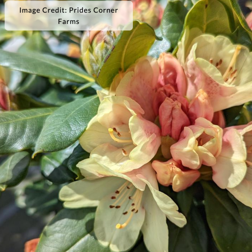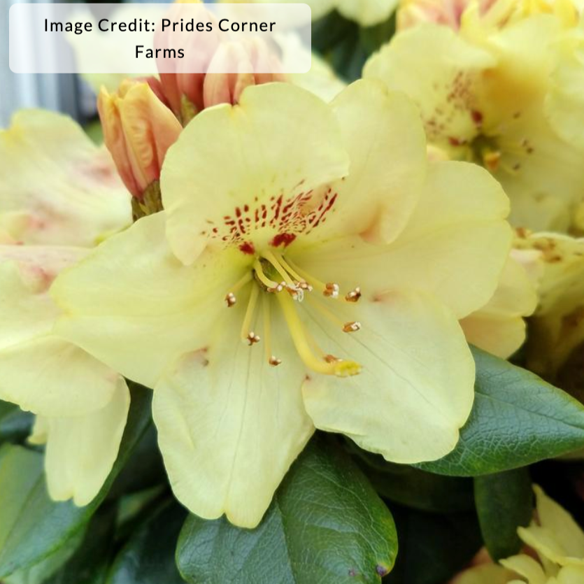 Gold Prinz is a smaller growing Rhododendron that is much wider than tall. This shrub would make for a lovely low growing informal hedge or grouped with other Rhododendrons in a shady woodland garden bed. The prolific trusses of flowers last for weeks in June. Beneficial pollinators are magically attracted to the bell shaped flowers, which are also great for cut flowers, lasting for many days in a vase. The evergreen foliage is also a great addition to a flower arrangement any time of the year.