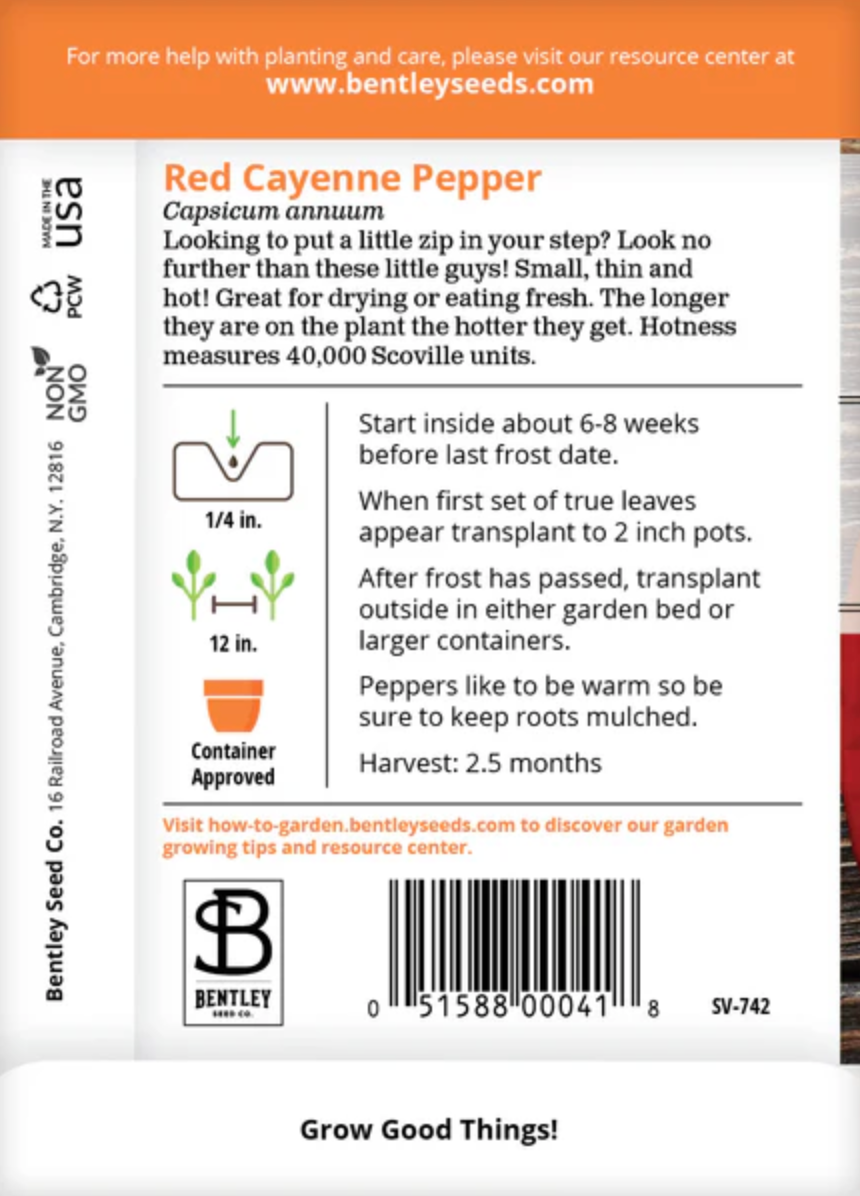 Start Bentley Seed long red cayenne pepper seeds inside about 6-8 weeks before last frost date. When first set of true leaves appear transplant to 2" pots. After frost has passed transplant outside in either garden bed or larger containers. Peppers like to be warm so be sure to keep roots mulched.