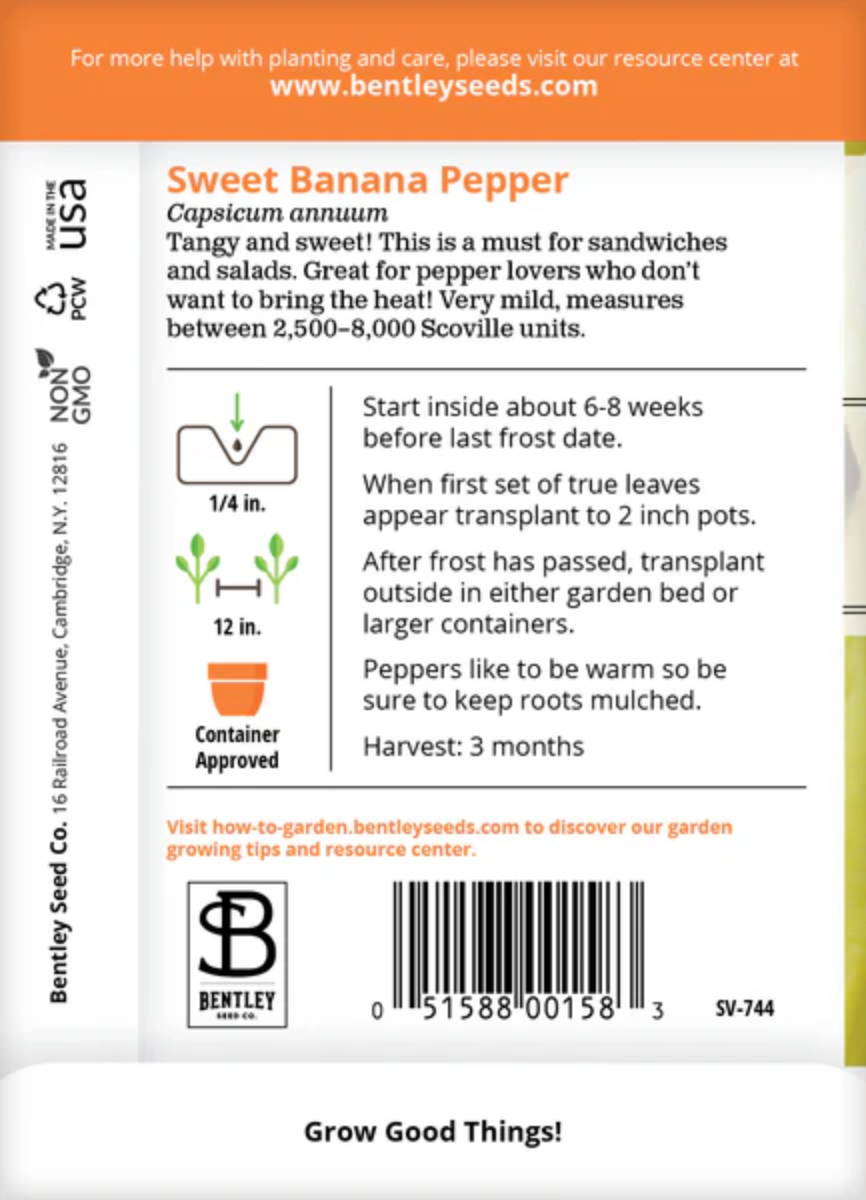 Start Bentley Seed Sweet Banana Pepper Seed inside about 6-8 weeks before last frost date. When first set of true leaves appear transplant to 2 inch pots. After frost has passed, transplant outside in either garden bed or larger containers. Peppers like to be warm so be sure to keep roots mulched. Harvest: 3 months.