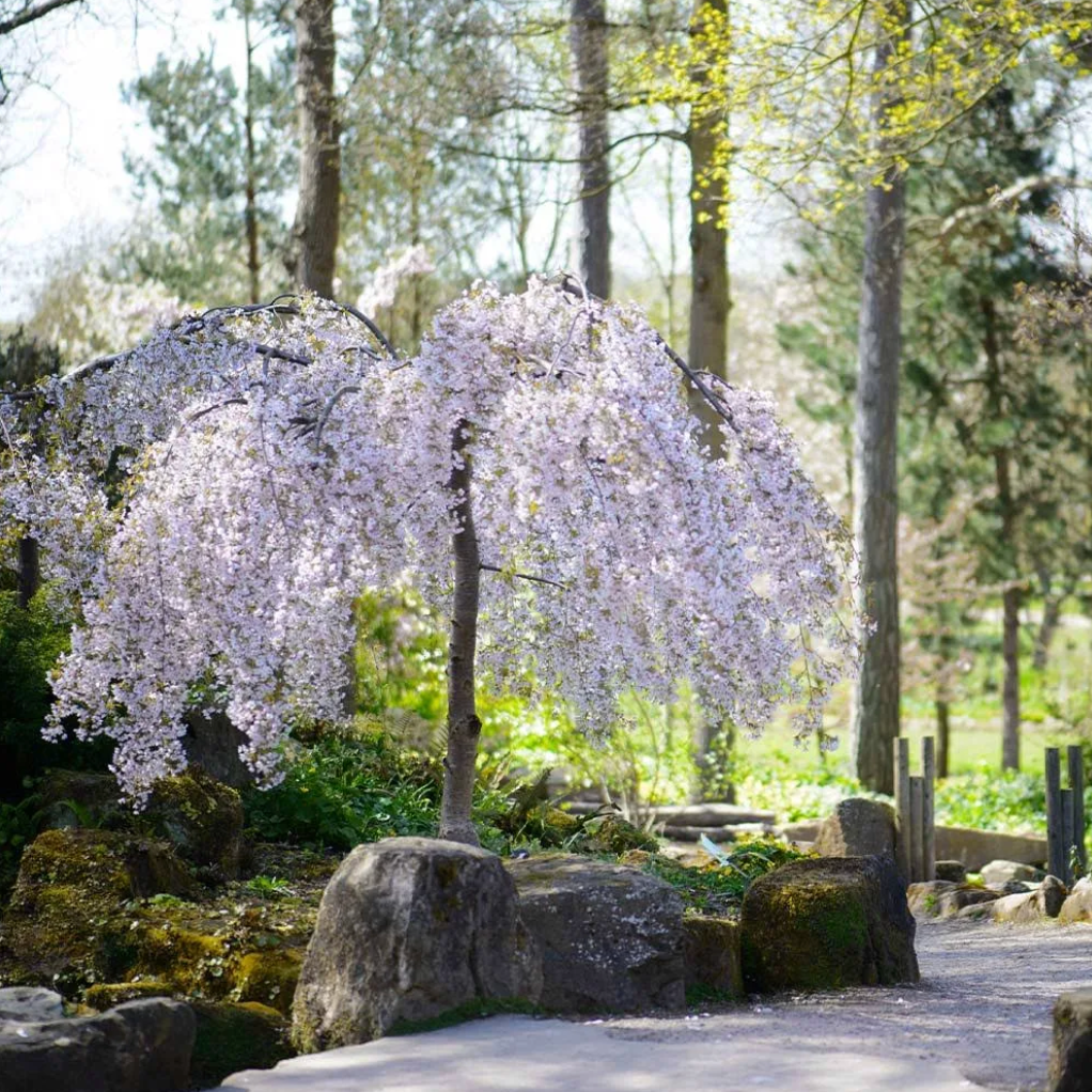 A stunning Lake County Nursery 'ZAM' introduction, this small, strongly weeping tree creates a breathtaking fountain of snow-white blooms in spring. Its graceful cascading branches are adorned with single white flowers, making it a striking focal point in any landscape. The dark green foliage transitions to rich golden and orange hues in fall, adding seasonal interest. While it produces small black fruit, it is sparse and does not detract from its ornamental appeal. This elegant cultivar is grafted on a 3' or 5' standard, enhancing its dramatic weeping form.