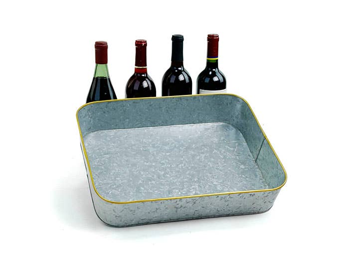 The Rectangle Galvanized Tray with Brass Trim is a stylish and functional accessory measuring 15 inches by 12 inches. With its sleek galvanized finish and elegant brass trim, this tray adds a touch of sophistication to your decor. Its versatile design makes it ideal for creating elevated gift baskets or organizing items on tables, effortlessly combining practicality and aesthetics in your home or event setup.