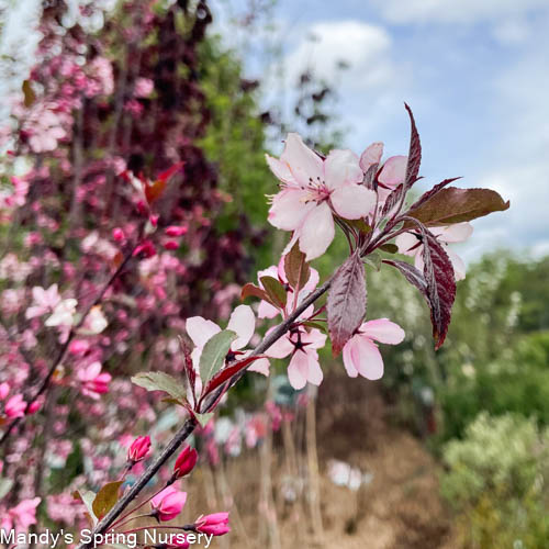 Certainly one of the prettiest red-leafed crabapples we've seen. Has a better summer color and appearance than most red-leaf crabapples. Abundant magenta-pink blossoms stand out handsomely against reddish-purple, cutleaf foliage. Shows good resistance to fireblight. Developed by J. Frank Schmidt & Son Co.